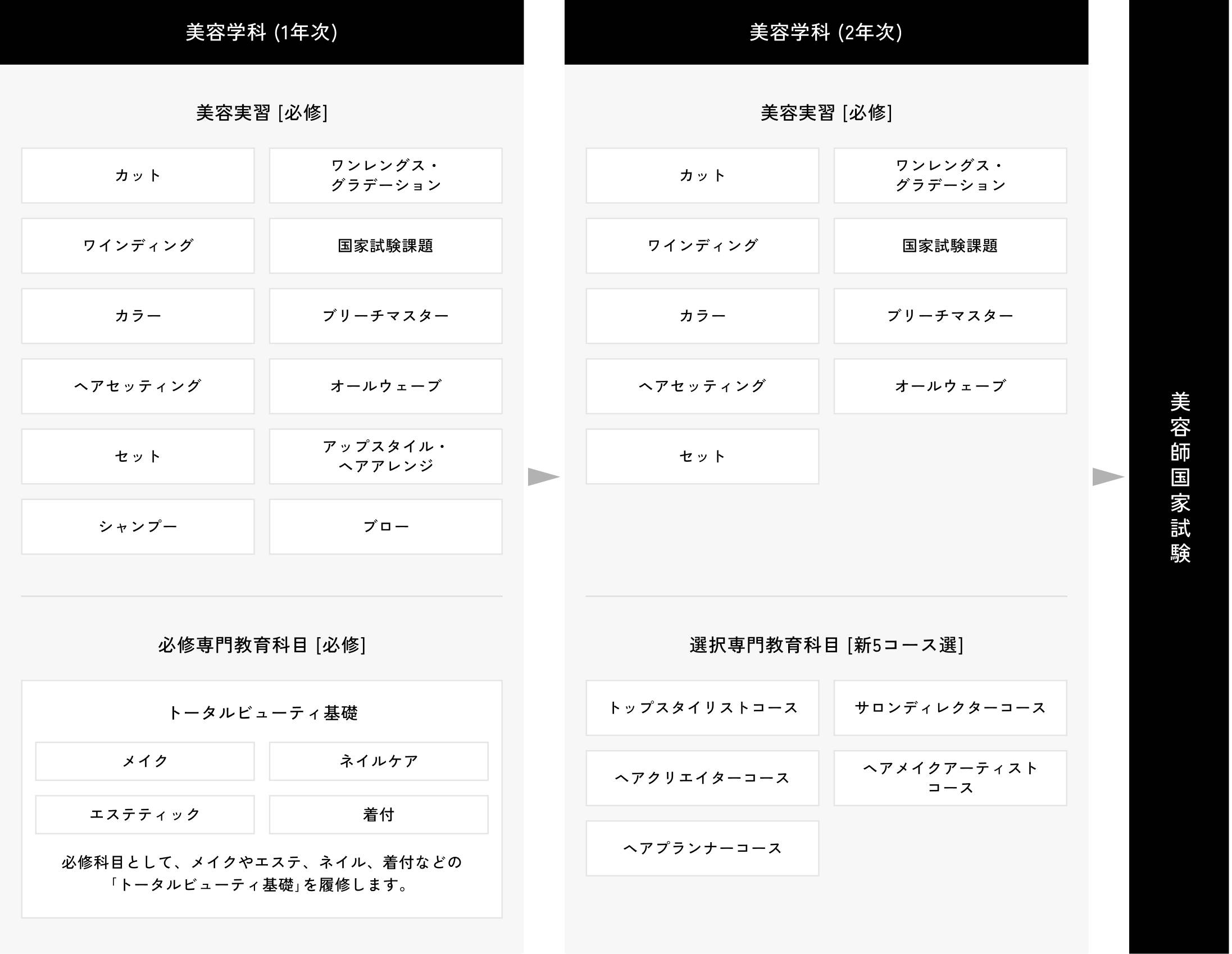1年次は、美容に関する基礎的な知識と技術を身につけます。 2年進級時には、それぞれの就職先を考慮して、5つの選択コースから選んで履修します。